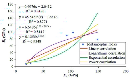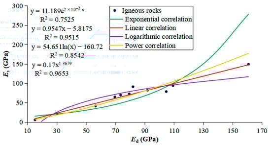 - Considering the correlation between static and dynamic moduli: In terms of different types of rocks, for igneous and metamorphic rocks, the optimal relationship between static and dynamic moduli of elasticity is a power-law correlation, with a value of (igneous R2 = 0.97, metamorphic R2 = 0.93), and for sedimentary rocks, a linear and nonlinear logarithmic correlation, with a value of (R2 = 0.91).