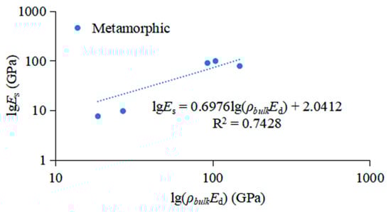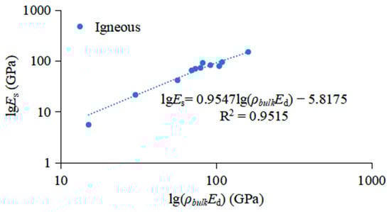 These relationships can be used for various rocks. They believe that the correspondence between the two moduli (Equation (9)) is quite low. By incorporating bulk density (g/cm3) into the relationship, a better estimate was found (Equation (10)). Therefore, based on the logarithmic relationship, the static elastic modulus can be better predicted.