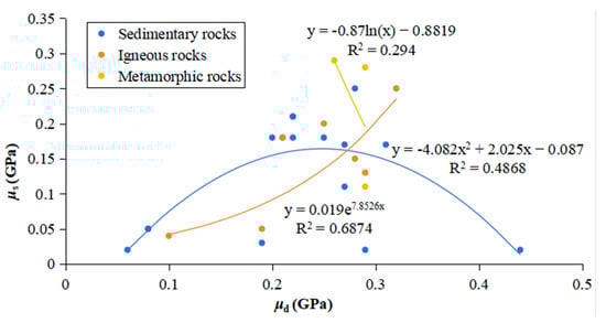 Figure 15 shows the fitting correlation between dynamic and static Poisson’s ratios for three different types of rocks; for igneous rocks, the best relationship between the static and dynamic Poisson’s ratios is an exponential correlation, with a value of (R2 = 0.69); for sedimentary rocks, they are polynomial relationship, which is (R2 = 0.48); and for metamorphic rocks, there is a logarithmic relationship, which is (R2 = 0.3). It is obvious that the correlation between them is very poor, and there is no regular relationship [59,60].