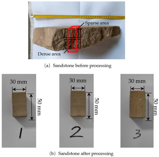 In order to make the pressure-less hydration absorption detection more scientific and referenceable, the sandstone with clear surface density area is selected for processing. The sandstone samples obtained using the wire cutting method are shown in Figure 2. A cuboid samples of rock with a size of were prepared, and the basic parameters of the sandstone rock samples are shown in Table 1.