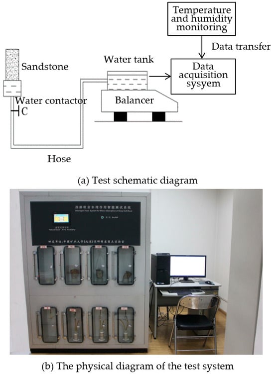 According to the field test, the analysis shows that the water in the sandstone of Mogao Grottoes mainly migrates in the rock mass through capillary action. The change law of physical and mechanical properties of sandstone under water capillary action was simulated by pressure-less hydration absorption detection. The schematic diagram of the real-time monitoring experimental system for the pressure-less hydration absorption detection is shown in Figure 8, and its mechanisms have been introduced in the previous literature [2].
