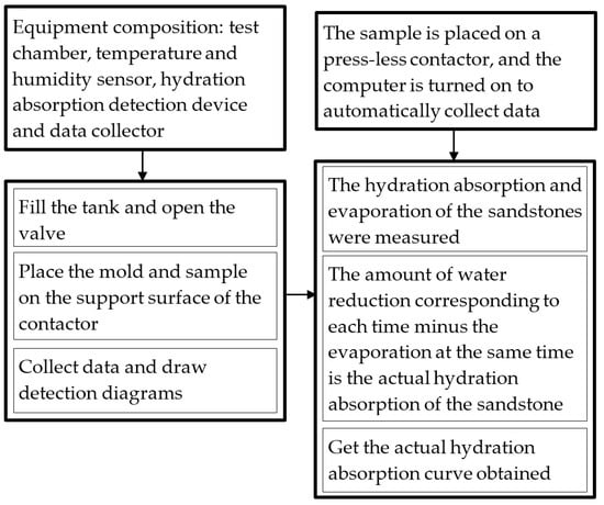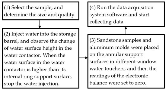 The pressure-less hydration absorption detection is carried out by using the above test system to analyze the hydration absorption characteristics of sandstone. The detection scheme can be divided into four main steps, as shown in Figure 9, and the program diagram of the intelligent test system is shown in Figure 10. The details can be found in these procedures.