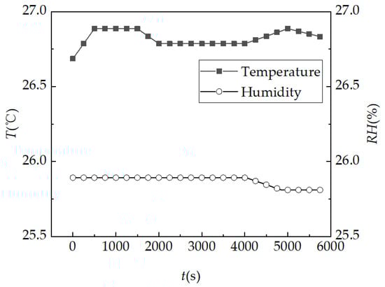 In the intelligent detection system, the ambient temperature and humidity during the pressure-less hydration absorption detection are shown in Figure 11. During the whole detection, the ambient temperature (T (°C)) is basically maintained at 26.8 °C and the Relative humidity (RH (%)) is basically maintained at 25.9%, and the detection time is expressed by t (s).
