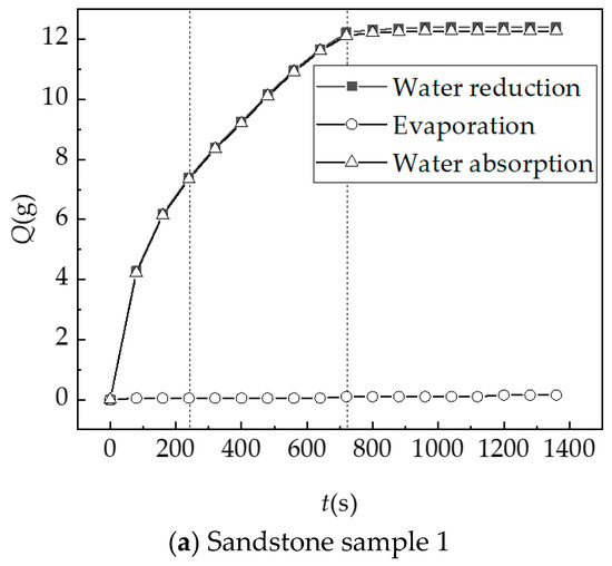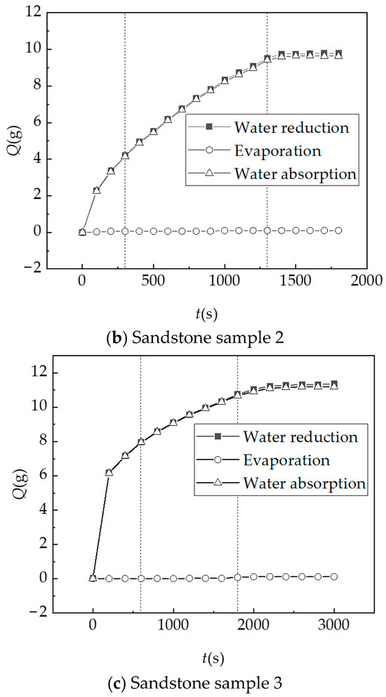 It can be seen from Figure 13 and Table 5 that the hydration absorption of the three sandstone samples have the consistent trend: in the initial stage, the water absorption and hydration of the rock mass are significant; in the later stage, the water absorption and hydration of the rock mass tend to be stabilized. The quality changes in sandstone samples before and after hydration absorption are counted, as shown in Table 6. Automatic measurement of hydration absorption is the mass of water reduction in the tank minus the mass of water evaporation. Artificial measurement of hydration absorption refers to the mass of sandstone samples after hydration absorption saturation minus the drying mass of sandstone samples before hydration absorption. It can be seen that the actual hydration absorption mass of automatic measurement is close to that of manual measurement after considering water evaporation.
