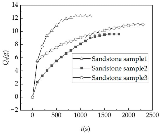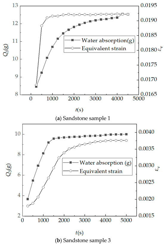 As shown in Figure 12, the hydration absorption of sandstone sample 1, 2, and 3 tend to be stable in 946s, 1613s, and 1990s. In order to compare the relative size of the hydration absorption of the sandstone samples, the actual hydration absorption curve is drawn, as shown in Figure 8. The index function shown in Equation (2) is used to fit the hydration absorption data points, and the results of the fitting curve parameters are shown in Table 5.