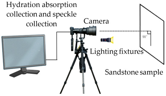 The automatic shooting detection device schematic diagram is shown in Figure 14. The composition of the whole automatic shooting experimental device includes an intelligent detection system for deep soft rock water physical action, a shooting system, one or more sets of adsorption water detection devices, and data collectors. The shooting system includes a camera, a tripod, a shading cloth, and a lighting device. The camera is mounted on a bracket with the lens directed towards the sandstone sample. The lighting equipment is aligned with the lens direction, and the tripod bracket allows for height adjustment. The data collector consists of a computer equipped with relevant software, which is connected to the camera through a data line to receive captured photos.