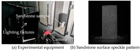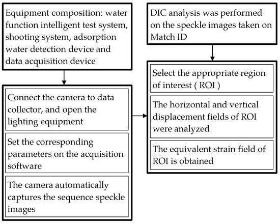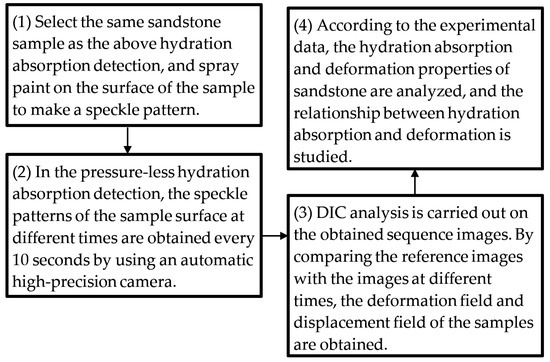 Studying the deformation behavior of rock is an important step to understand the properties of rock. At present, the direct contact method is mostly used to study the deformation characteristics of rock. Digital image correlation (DIC) is a non-contact strain analysis technology based on digital image processing, which has become one of the important means to study the mechanical properties and deformation characteristics of materials. In laser speckle measurement, DIC is used to measure the surface displacement component, and an image scanner connected to a computer records the laser speckle pattern of the object and is stored in the memory in a reference and deformation configuration. The subset and reference of the formed image are numerically used as a measure of surface displacement [10,11]. Yang et al. [12] studied the delayed behavior of unsaturated argillaceous rocks using the DIC technique, and discussed the time-dependent behavior observed at different scales. Based on the DIC non-destructive optical technique, Zhang et al. [13] measured the full-field displacement of the sandstone surface and determined the crack initiation and crack length evolution. Wang et al. [14,15,16] studied the mechanical behavior of mudstone at the composite microstructure scale by using environmental scanning electron microscopy (ESEM) imaging and DIC technology, and found some irreversible phenomena in the drying and wetting process of mudstone at the micron scale. Luo et al. [17] studied the deformation behavior of soft and hard interbedded rock using DIC, and studied the deformation and failure characteristics of horizontal soft and hard interbedded rock samples under uniaxial compression. Ji et al. [18] used the DIC experimental platform of coal rock deformation damage to carry out the surface deformation observation test of coal rock around the borehole during the progressive damage process. Yang et al. [19] studied the multi-dimensional non-uniform deformation and failure characteristics of siltstone through linear differential transformer (LVDT), DIC, computational tomography (CT), acoustic emission (AE), and ultrasonic velocity. Xin et al. [20] analyzed the evolution of the strain field on the surface of the sample through DIC, and initially gave the relationship between the proposed stress–strain curve and the strain field. Yao et al. [21] studied the effect of inclusions on the fracture evolution and mechanical properties of mortar structure, and analyzed the deformation characteristics using DIC technology. Based on the multi-fractal of high-speed digital image correlation (HS-DIC) technology and quality screening method, Jin et al. [22] investigated the evolution trend of surface cracks during crushing and the distribution characteristics of sample fragments after crushing from the perspective of a fractal. Martin et al. [23] analyzed the effect of four different tension levels on the strain/stress of the hole specimen based on the DIC system calibration procedure. Yan et al. [24] carried out uniaxial compression experiments on red sandstone samples, analyzed the slow deformation waves under different loading rates, and combined them with DIC technology for microscopic characterization. However, when measuring rock deformation, there are few methods using non-contact measurement technology, and the research on using the DIC method to analyze the hydration absorption process of rock is not sufficient.