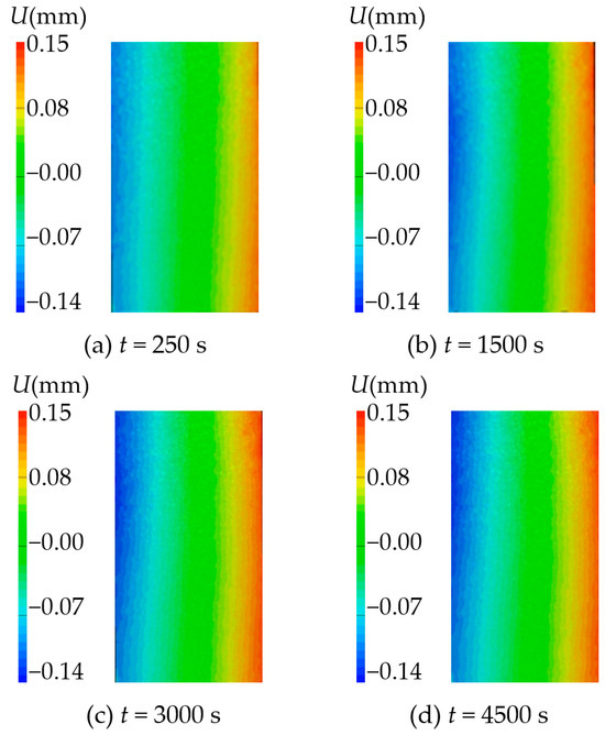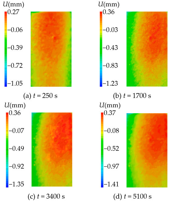 Sandstone samples 1 and 3 were used for analysis, and the displacement field of the sample surface at different hydration absorption times was obtained. The samples produced horizontal displacement (U(mm)) and vertical displacement (V(mm)) after hydration absorption, which is caused by the expansion of pore hydration absorption. The horizontal displacement field at a different time is shown in Figure 18 and Figure 19. By observing the displacement cloud diagram of sandstone sample 1, it was found that the horizontal displacement of the sample after hydration absorption is not uniform. The specific performance is that the displacement of the upper half is larger than that of the lower half, and the left half is dominated by negative displacement, while the right half domain is dominated by positive displacement. There is almost no displacement in the middle domain, which is due to the constraint effect in the middle of the sample. The displacement cloud diagram of sandstone sample 3 reveals a notable disparity between the upper and lower halves, with greater displacement observed in the former. Negative displacement prevails in the left domain, while the middle and right domains predominantly exhibit positive displacement. The analysis shows that the horizontal displacement cloud diagram of sandstone sample 1 is more in line with the actual situation of sandstone hydration absorption and expansion.