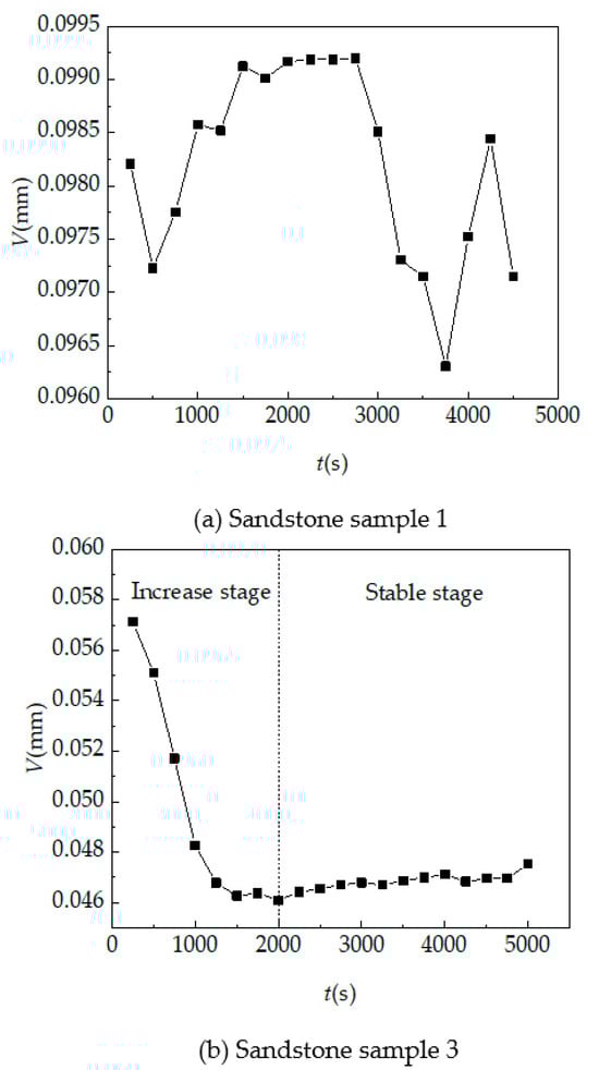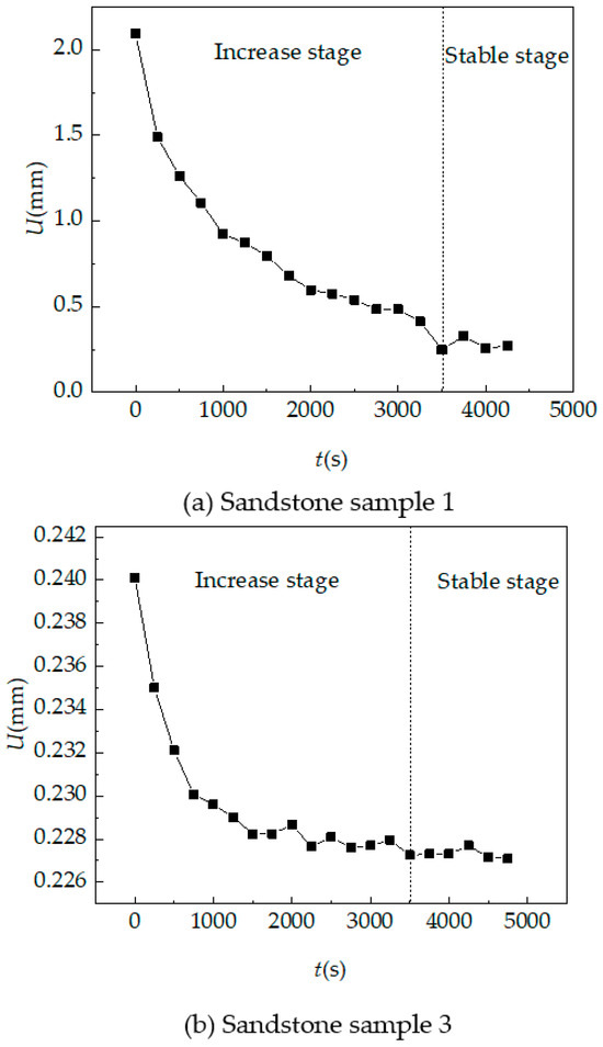 The vertical average displacement curve is shown in Figure 23. It can be seen that the sandstone sample 3 will produce a large displacement at the beginning. With the increase in time, the vertical displacement of the sample gradually flattens out, and finally tends to be constant, which better reflects the characteristics of the vertical average displacement of sandstone after hydration absorption and expansion. The vertical average displacement curve of sandstone sample 1 is tortuous and the error is large, so the law cannot be obtained. It is believed that the error is caused by the poor sample speckle quality.