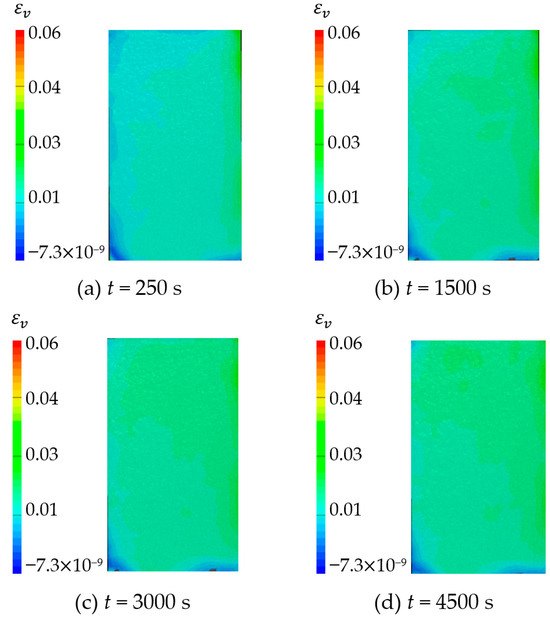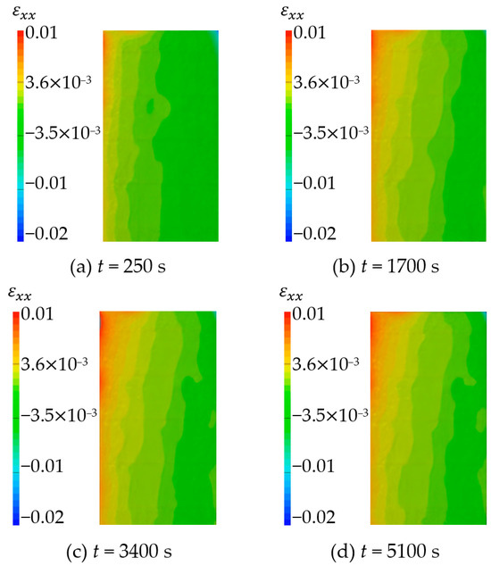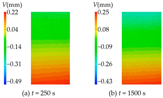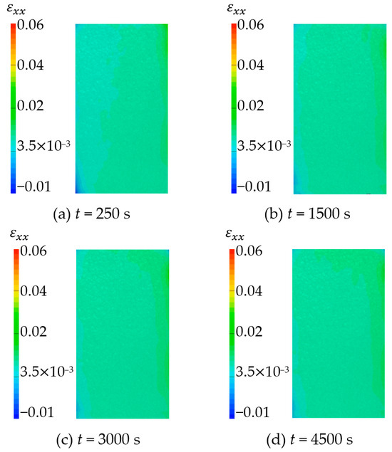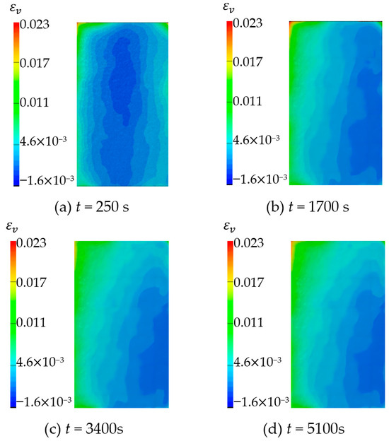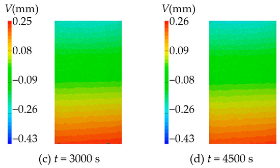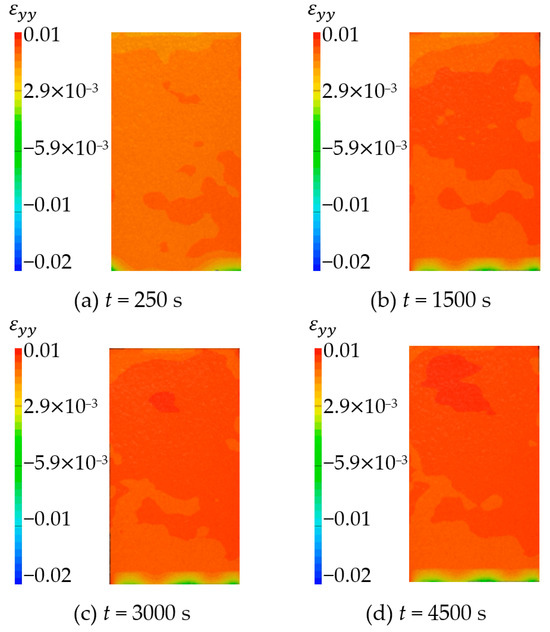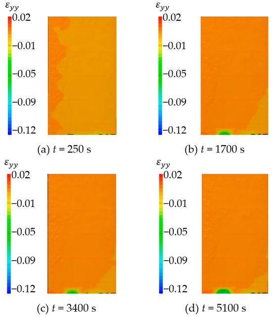 The vertical strain field () at different time is shown in Figure 27 and Figure 28. By analyzing the strain cloud diagram of sandstone sample 1, it can be found that the vertical strain throughout the sample domain exhibited irregular growth following hydration absorption. This observation indicated that the strain in the upper half exceeded that in the lower half. The overall change trend of the strain cloud diagram of sandstone sample 3 is the same as that of sandstone sample 1. The vertical strain of the whole domain increases with time during the hydration absorption detection, and the change is more uniform.