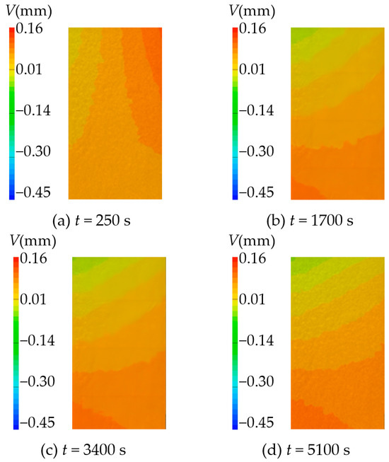 The vertical displacement fields at different moments are shown in Figure 21 and Figure 22. By observing the displacement cloud diagram of sandstone sample 1, it is found that the vertical displacement of the sample after hydration absorption is not uniform. The specific performance is that the displacement of the upper half is larger than that of the lower half. The upper half is dominated by negative displacement, and the lower half is dominated by positive displacement. There is almost no displacement in the middle-down regions. The displacement cloud diagram of sandstone sample 3 shows that the inhomogeneity of vertical displacement is low. In the initial stage, the displacement of the upper right corner surpasses that of the upper left corner. In subsequent stages, the displacement of the lower left corner surpasses that of the upper right corner, indicating that the displacement of the upper part of the whole is greater than that of the lower part.