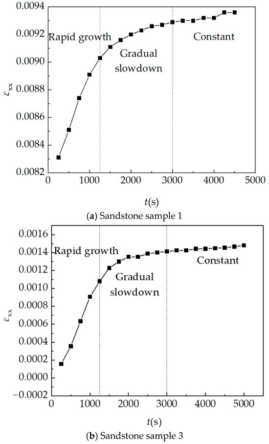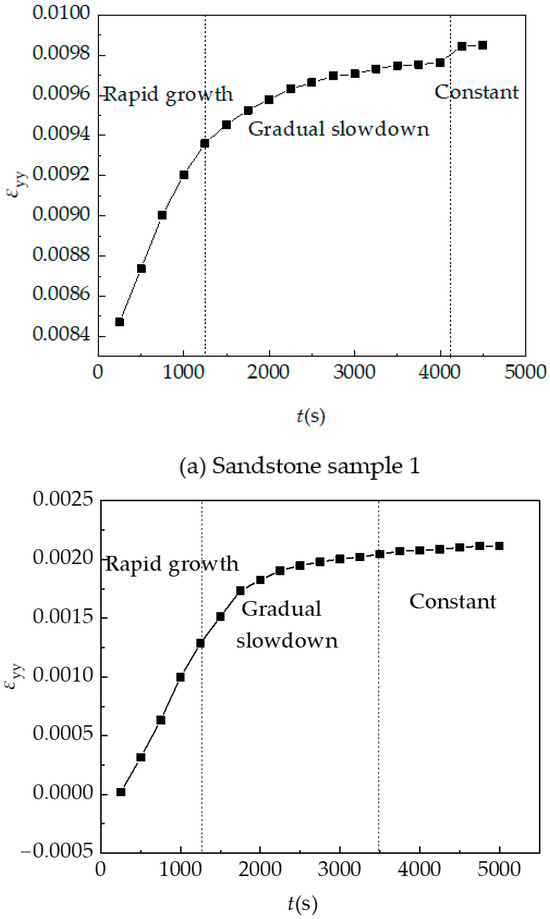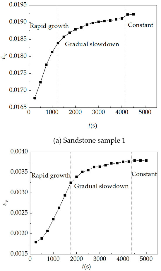 The vertical strain curve is shown in Figure 29. With the change of time, the vertical strain curve of the sample experienced three stages: rapid growth, gradual slowdown, and constant. It is considered that these two curves can better reflect the vertical strain characteristics of sandstone after hydration absorption and expansion.