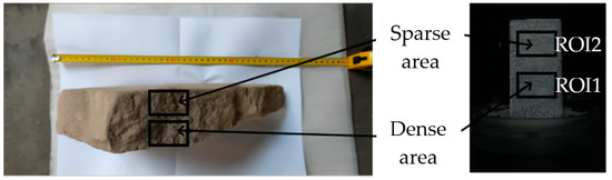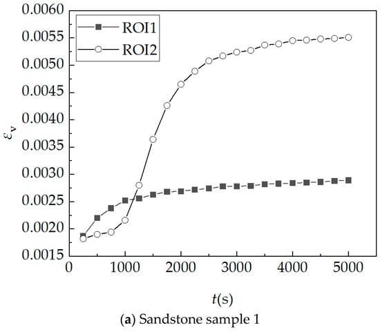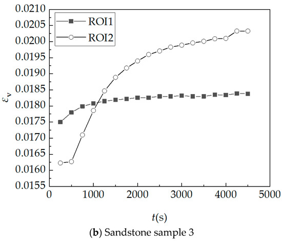 The two regions of sandstone sample 1 and sandstone sample 3 are studied as regions of interest (ROI), where ROI1 represents the dense area, and ROI2 represents the sparse area. The equivalent strain–time curves of the two areas are shown in Figure 35. Through observation, it is found that the equivalent strain of the two areas increased with time after the sample absorbed water. In the initial stage of hydration absorption, ROI1 deforms first. With the increase in time, ROI2 begins to deform, and the equivalent strain of it increases rapidly, which soon exceeds and is greater than that of ROI1, and the two curves tend to be gentle in the end. It is speculated that the reason why the difference between the two curves is so large is that there are more pores in the sparse area and the deformation after hydration absorption is also greater. At the same time, due to the contact between the dense area and the water surface during the experiment, the deformation of the dense area is greater than that of the sparse area in the initial stage, and the sparse area is deformed after a period of time. It is believed that for the Mogao Grottoes sandstone, the sparse area with larger pores will produce much larger deformation than the dense area after hydration absorption. When protecting the Mogao Grottoes sandstone, the sandstone layer with sparse bedding should be paid more attention and needs further and more in-depth research.