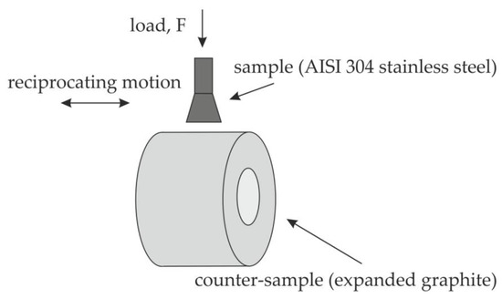 The literature on the effect of operating conditions on the lubricating properties of carbon materials and the ability to form a sliding layer is primarily concerned with carbon, graphene, or graphite-modified plastics [16,17,18,19]. Even though these materials belong to the group of carbon materials, they are characterized by different tribological properties. Hongyun et al. [20] introduced expanded graphite and natural graphite into the friction materials and examined the tribological properties of the obtained composites. The results showed that the expanded graphite composite displayed better lubricity in both the fading and the recovery processes. Meanwhile, PTFE filled with carbon fiber based on polyacrylonitrile (PAN) showed the lowest friction and wear in tests with respect to other fillers. The tribological mechanisms of low friction and wear were attributed to the protective layer formed on both surfaces of the sliding pairs [21]. Wang et al. [16] showed that the amount of friction and wear of a tribological pair is influenced by the amount and size of graphite particles introduced into the plastics. As the size of graphite particles in the plastic increased, the wear rate increased with increasing load. The resulting layer was not durable enough. Large graphite particles were removed from the surface contact zone due to poor interfacial adhesion between graphite and plastic. Studies on the effect of pressures on the polymer–graphite filler friction node have shown that as the pressures increase (0.5, 1 and 1.5 MPa), the value of the coefficient of friction and wear decreases [22]. However, some studies report that at relatively low pressures, the formation of a graphite protective layer is not possible [23,24,25]. Analyzing the effect of speed on the operation of the graphite–stainless steel friction node, it was shown that at higher speeds there was a decrease in the coefficient of friction, which was explained by the formation of a thicker sliding layer [18]. At the same time, the aforementioned studies showed that wear increased with increasing speed. The above studies are confirmed by the authors of the paper [26]. The operating environment is also of great importance for the operation of graphite. Graphite wear changes with an increase or decrease in relative humidity [21,26,27,28,29,30]. In practice, tribological associations in which one of the materials is graphite are widely used in work in the aquatic environment [13,31,32]. Due to the adsorption of water, graphite has good lubricating properties [33]. The adsorbed water molecules on the main sliding planes reduce the adhesion between them and thus reduce the coefficient of friction during their sliding. On the other hand, studies indicate that a larger amount of water in the tribological combination contributes to too rapid wear of the tested surfaces [34]. Water leaches out the resulting wear particles, which are necessary for the formation of a sliding layer [35,36]. According to Hirani and Goilkar [34] and Wang et al. [37], water hinders the formation of a transfer film on the graphite mating surface. It should be noted that in many sealing and bearing applications, the friction pairs are immersed in liquids, and the mechanism of low friction is still not very clear. Somberg et al. [38] studied the effect of graphite as a filler in polymer, which showed that the formation of a sliding layer was hindered when lubricated with water, resulting in lower friction and wear than with pure polymer. The presented research shows that there is no clear answer to the question of how water affects the resulting graphite sliding layer. There is a significant lack of research on the operation of the expanded graphite–stainless steel tribological pair in an aqueous environment. Meanwhile, this pair is widely used in popular piston valves. In this type of valves, a cylindrical piston made of stainless steel moves between graphite sealing rings. The sealed medium is usually water. Practical knowledge indicates that these valves have problems related to frictional resistance and accelerated wear of cooperating parts. To confirm this fact, literature was cited indicating the existence of practical problems related to the reliable operation of the analyzed pair of materials [39,40,41,42,43]. The sliding layer created during operation of the expanded graphite-steel combination affects the effectiveness of the friction process. Knowledge of the factors determining the properties of the sliding layer will make it possible to reduce friction resistance in the future through the proper design and selection of sliding pairs for given applications. The large number of factors affecting graphite transfer means that, it is difficult to determine which of the elementary friction phenomena dominates under specific conditions. The lack of scientific research on the mentioned tribological pair makes it difficult to properly select operating conditions. Therefore, the novelty in the presented research is primarily the set of materials used for the research. Moreover, due to the wide use of expanded graphite in industry, the research performed can be used not only in sealing technology, but also in many other industries. In construction, for example, expanded graphite is a key ingredient in fire-resistant building materials such as fire-resistant coatings, plasterboard, and insulation. In the automotive industry, it is used in battery systems and thermal management materials. It is worth noting that the global expanded graphite market size is estimated at 76.75 kilotons in 2023 and is expected to reach 110.90 kilotons by 2028 [44]. Therefore, it is believed that knowledge of the properties of expanded graphite is crucial for its further development.