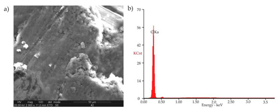 The morphology of the selected samples was performed after the test to assess the chemical composition of the sliding layer. The analysis of the chemical composition of the layer carried out showed that the material from which the layer came into being was coal (Figure 2).