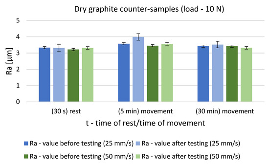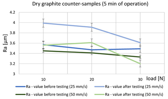 Change in the values of the Ra roughness parameters of steel samples working with dry graphite rings in a 5-min cycle under loads of 10, 20, and 30 N and speeds of 25 and 50 mm/s.