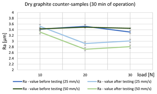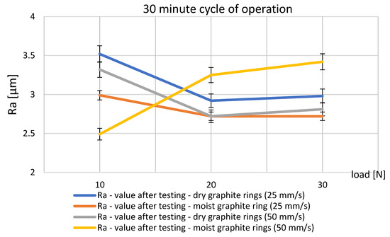 Change in the values of the Ra roughness parameters of steel samples working with dry graphite rings in a 30-min cycle under loads of 10, 20, and 30 N and speeds of 25 and 50 mm/s.