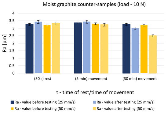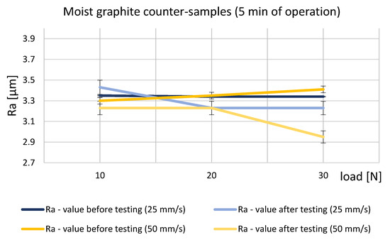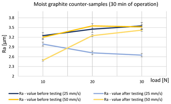 Change in the values of the Ra roughness parameters of steel samples working with moist graphite rings for 5 min under loads of 10, 20, and 30 N and speeds of 25 and 50 mm/s.
