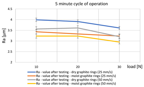 Next, the results of the surface roughness of steel samples, after working with dry and moist graphite rings, were compiled on the charts (Figure 9 and Figure 10). The results of surface roughness tests after conducting two cycles of work—5 and 30 min—are summarized.