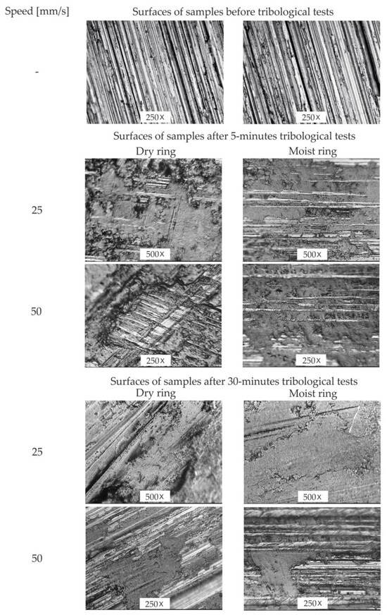 During the 30-min operation of the friction node, the presence of moisture did not clearly affect the results. At a speed of 25 mm/s in the friction node working with soaked samples, there was a significantly greater decrease in roughness than for the friction node working dry. On the other hand, at a speed of 50 mm/s, as the load increased, the presence of moisture affected the increase in the roughness of the counter-sample. This phenomenon was not observed for the dry-running counter-sample, where the surface roughness decreased with increasing load. In order to show the differences in the structure of the emerging layer on the steel sample working with the dry and moist graphite counter-sample, photos of selected surfaces, before and after the experiment, working in 5 and 30-min cycles, at speeds of 25 and 50 mm/s and a load of 30 N are summarized (Figure 11). Observational studies of the surfaces of steel counter-samples confirmed the results obtained while examining the surface roughness that the moisture content of the operation of the tested friction node had a strong influence on the resulting sliding layer. The graphite layer that is formed under dry conditions did not always cover the entire surface of the metal counter-sample. The operating time of the friction node, the set load, and the speed were also significant. After 5 min of operation of steel samples with moist rings, a significant smoothing of the surface was visible, compared to the surface working with dry rings. In turn, after 30 min of work at a speed of 25 mm/s in humid conditions, the greatest smoothing of the steel surface occurred. The steel surface working in dry conditions had an unevenly applied layer of graphite. Imaging studies confirm the results presented in Figure 10 (blue line). The speed increase to 50 mm/s contributed to a greater smoothing of the steel surface cooperating with the dry ring. Expanded graphite filled the irregularities in the surface. The opposite phenomenon was observed when the steel surface operated with a moist ring. Exposed roughness peaks were visible on the surface of the tested sample. The graphite layer did not cover the surface evenly. This phenomenon was also reflected in the surface roughness results of the samples (yellow line—Figure 10).