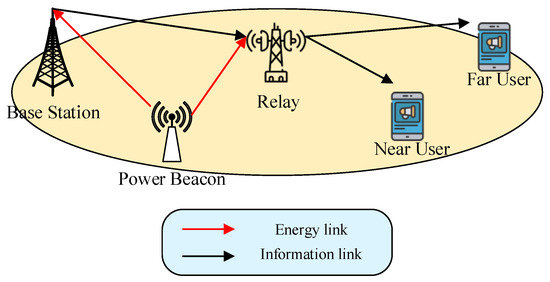Recently, NOMA and cooperative relaying NOMA (C-NOMA) combined with EH have been hotly studied [32,33,34,35,36,37,38]. In [32], the authors investigated spatial modulation-based CNOMA for the BS downlink using a full-duplex near user that might collect energy and transmit data to a far user. Ref. [33] investigated collaborative user pairing and resource allocation for WPT-based CNOMA with EH near users. In [34], EH is carried out with CNOMA, and it is taken into consideration by choosing the optimal (decode-and-forward) DF relay. Only a two-user downlink NOMA and the dual-hop scenario are taken into account in the system model and analysis. When there are many EH-based amplify-and-forward (AF) relays between the base station and the far user, the best one can be chosen for data forwarding [35]. In [36], a two-user CNOMA network is explored, with the source node’s power consumption lowered to meet the needed transmission rates using both TS relaying and PS relaying strategies. The Lyapunov optimization methodology is utilized by the authors in [37] in order to maximize throughput or restrict transmit power levels. For a wireless-enabled IoT network, the author in [38] proposes a fairness-aware NOMA-based scheduling system. Additionally, they suggest boosting network through throughput-aware NOMA-based scheduling.