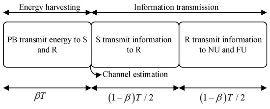 Furthermore, we considered the TS protocol for our proposed network as depicted in Figure 2. In particular, the PB transmits the energy to S and R during the period time of in the EH phase, where denotes the TS factor, and T denotes the coherence time block. For the information transmission phase, the remaining time, , is divided evenly into two hops of transmission, where S and R employ the transmit power derived from the gathered energy for transmitting and relaying operations. Moreover, in the information phase, the channel cannot be perfectly estimated due to the complex channel intricacies. Thus, the channel for the information phase can be modeled as [50]