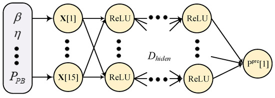 Firstly, in order to solve a regression problem, we generated a DNN model. As shown in Figure 3, the DNN model was composed of an input layer, multiple hidden layers, and an output layer. Moreover, in an input layer, we had 15 neurons corresponding to 15 parameters as shown in Table 2. Next, each hidden layer had neurons. Furthermore, each hidden neuron employed the rectified linear unit (ReLU) as the nonlinear activation function, defined as [51]