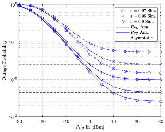 The outage probability versus when varying dBm.
