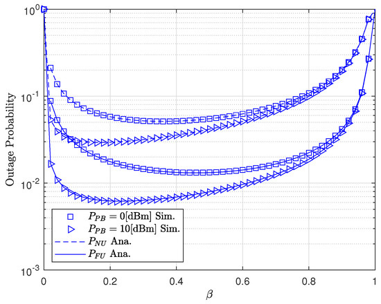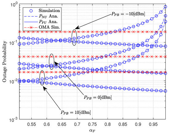 Figure 6 depicts the OP of users versus in dBm with varying . As shown in Figure 6, we can observe that the OP increased when decreased and converge with a large . This is due to the OP depending on the interference channels in the SINR of two users when decoding the signal. In Figure 7, we plotted the OP versus when varying in dBm. First, we can observe that the OP of FU decreased when increased. The reason was that when increased, the transmit power of FU was greater than that of NU. Furthermore, the OP of NOMA was better that OMA in the range . In addition, there existed an optimal point for the OP of two users. Specifically, when dBm the optimal point for the OP of two users was , for dBm, and for dBm.