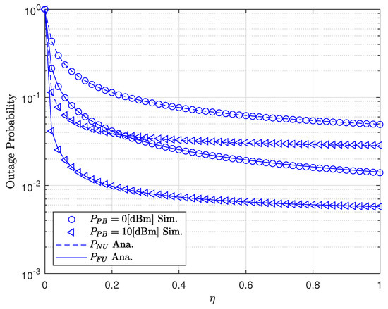 Figure 8 shows the OP of two users versus when varying . It can be observed that the OP was improved when increasing the energy efficiency . This is due to the energy efficiency being larger, leading to a greater transmit power of PB in (4) and (5). Figure 9 illustrates the OP of two users versus when varying . The TS factor is important because it controls both the data transport and the amount of energy collected at S and R. We can observe that the best OP for two users for dBm can be achieved when , and for dBm, the best OP can be achieved when .