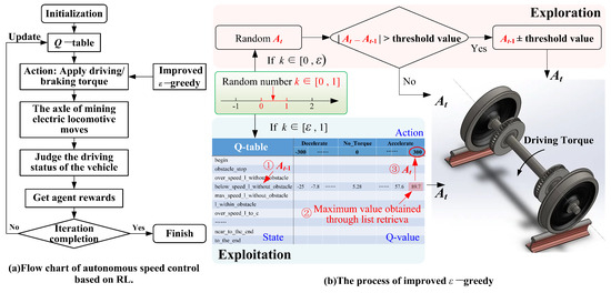 After setting up the intelligent agent, state, action, and reward function, a complete creep control framework for mining electric locomotives should be designed. As shown in the Figure 8, the mining electric locomotive serves as an intelligent agent to determine the current state based on the conditions of the environment at the current moment t. Then the intelligent agent uses an improved -greedy method to select the actions to be executed, obtain the current action , and apply it to the axle. Finally, the intelligent agent obtains the corresponding reward value based on the current environment and state. This reward is used to update Q-table.