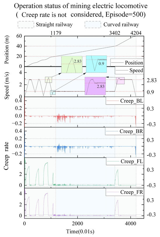 In terms of controlling the creep rate, it can be seen that the creep rate fluctuates greatly during vehicle acceleration, which can easily lead to wheel spin. Meanwhile, when the vehicle is driving in a bend, there is also a fluctuation in creep rate, indicating the possibility of some wheels slipping at certain times during the turning process. After training the agent, it can be seen that as the number of iterations increases, the idle time during the vehicle acceleration process significantly decreases, almost eliminating the phenomenon of the vehicle slipping on curves. When the intelligent agent is trained 500 times, the creep rate of the vehicle during acceleration can be controlled within the range of 0.1 to 0.4. This indicates that the creep rate between the wheels and rails is well controlled during vehicle operation and is well utilized to drive wheel acceleration. This proves that the design of our learning algorithm is reasonable and effective, which can better utilize the creep rate and achieve the goal of safe and efficient creep control.