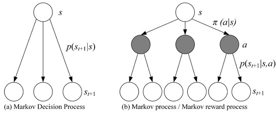 The MDP adds a decision layer to the commonly used Markov Process/Markov Reward Process, which is the action a shown in the Figure 5. This means that when the agent is in the state at time t, it must first decide on a specific action a to take in order to reach the middle layer, which is the black node in the diagram. After reaching the black node, the state of the agent at the moment t+1 also depends on the probability distribution.