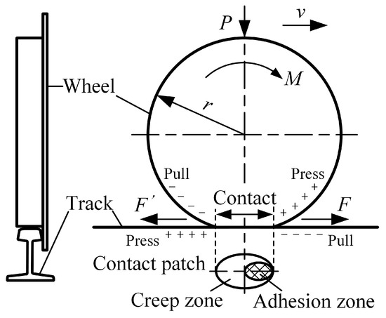 Two conditions must be met simultaneously to enable rail vehicles to run along the track [17]. One is that the rotating torque is applied to the moving wheel, and the other is that the contact between the moving wheel and the steel rail has a frictional effect. As shown in Figure 6, the moving wheel is in contact with the track due to the vertical force P applied by the vehicle body, and generates a motion trend under the torque M transmitted by the transmission device [18]. Assuming that there is static friction between the wheel and rail, the force F’ generated by the moving wheel on the track is equal in magnitude to the force F generated by the track on the moving wheel, but in opposite directions. For the mining electric locomotive, rim traction force F is the driving traction force. But the wheels of rail vehicles mostly have conical tread, which can cause elastic-plastic deformation when the wheels come into contact with the rail. The mining electric locomotive is subjected to shock and vibration during operation. When the wheel set rolls on the rail, it is accompanied by longitudinal and transverse sliding. There is no pure static friction state between the wheel and rail, but rather ‘slight movement in stillness’ and ‘slight sliding in rolling’. This phenomenon is creep, also known as adhesion between wheel and rail. The maximum longitudinal horizontal force in the adhesive state is the adhesive force, and the ratio of adhesive force to vertical load P is the adhesive coefficient . According to Hertz elasticity contact theory [19], the contact area between the wheel and rail is approximately elliptical. The area where the wheel and rail are relatively stationary and do not slide under the action of positive pressure is called the adhesion zone. The area where slight sliding occurs is called the creep zone. As the driving torque M increases, the creep zone becomes larger and the adhesion zone decreases to 0, and the wheels are in a sliding state. Therefore, when the vehicle is in traction or braking conditions, if the traction or braking force is greater than the adhesion between the wheels and rails, the wheels will idling or slip. This phenomenon can cause damage to the wheel rail tread and even affect the safety of rail vehicles.