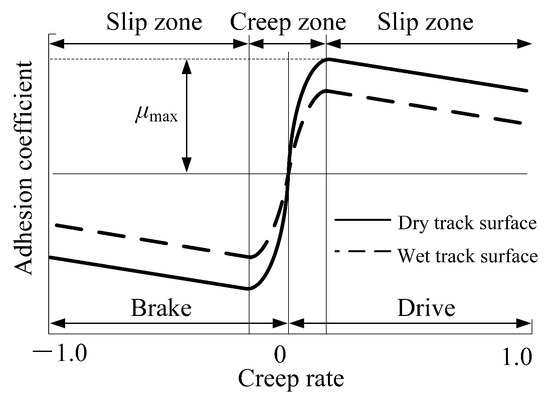 As shown by the adhesion characteristic curves under dry and wet rail surface conditions in Figure 7, when the creep rate is within the range of −10% to 10%, the absolute value of the adhesion coefficient between the wheel and rail rapidly increases under braking/traction conditions [20]. When the creep rate is within the range of −30% to −10% and 10% to 30%, the absolute value of the adhesion coefficient between the wheel and rail reaches its optimal value under braking/traction conditions. When the creep rate is around ±20%, the wheel rail adhesion coefficient will reach its peak, and at this time, the vehicle can obtain maximum ground braking/traction force, which can minimize the braking distance. Therefore, controlling the creep rate within the range of ±10% to ±30% is an ideal control goal.