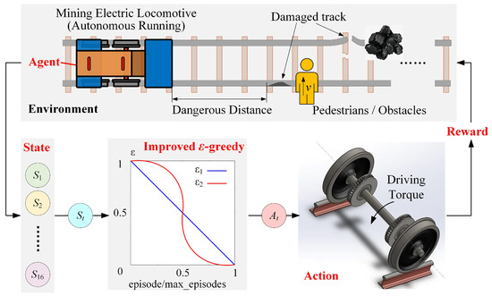 Mining electric locomotives have the transportation function of materials, equipment, and people in roadway. Safe driving of mining electric locomotives is crucial. However, the method of underground mining is often used in the Chinese coal mining industry [1]. In deep underground confined spaces, there are unfavorable conditions for driving in coal mine roadway, such as slippery, muddy, dusty, foggy, and complex human behavior, which lead to frequent accidents. Reducing personnel participation and ensuring the safe operation of production and transportation equipment are necessary to ensure the safety production of coal mines. At present, the intelligent development of coal mine equipment has become an inevitable trend [2]. Unmanned transportation of coal mine equipment can fundamentally solve the problem of personnel participation and reduce casualties in the event of inevitable accidents. We have conducted relevant research on autonomous mining electric locomotives [3]. The mining electric locomotive has achieved functions based on Reinforcement Learning (RL) and improved -greedy such as autonomous and efficient operation on speed limited sections, maintaining a safe distance from vehicle in front, and avoiding obstacles.