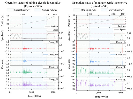 We take the results every 125 iterations and plot the real-time position, speed, and creep rate of each wheel of the mining electric locomotive. From the 125th iteration to the 500th iteration (Figure 10 and Figure 11), the mining electric locomotive can achieve their destination. However, the speed change is different. It can be easily observed that the mining electric locomotive cannot fully achieve the maximum speed limit for straight or curved roads during the initial training stage, and the vehicle cannot stop at its destination. As the training progresses, the mining electric locomotive acceleration increases.It can operate efficiently on speed limited sections, with accurate braking at the destination. On the first straight section of the road, the mining electric locomotive can maintain a safe distance when encountering obstacles.