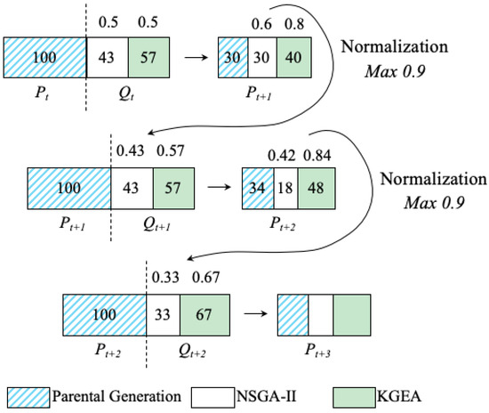 - We design a Knowledge-Guided Competitive–Cooperative Evolutionary Algorithm (KCCEA) framework. Initially, a method based on allocation ratios allows the two algorithms to cooperate. Then, during the evolutionary process, the algorithms continually update the allocation ratio dynamically by assessing the success rates of producing superior offspring, allowing the two algorithms to compete. This method achieves an improvement in search speed and solution quality;