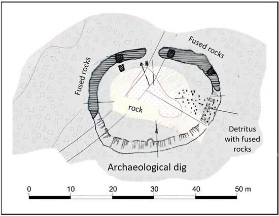 Bertolani [] initially presented data on the spatial distribution and petrographic characteristics of the vitrified rocks on Serravuda Hill. Recently, other authors added further insights [,]. The vitrification process involved the upper portion of a rocky debris deposit localized along the northern and northwestern edges of the flat hilltop. This deposit forms an elongated structure, arched at the ends, like a wall about 45 m long (20 m and 25 m each part) and with an average thickness of about one meter (see Figure 1).
