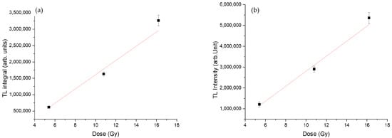 TL signal growth as a function of applied beta dose (5.5, 11, 16.5 Gy) in (a) sample SE2 and (b) sample SE13. The signal refers to the results of the “Pre-bleached with Blue LED” protocol.