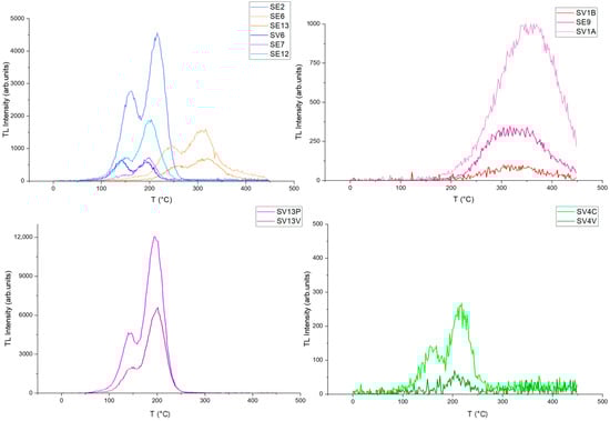 In all samples, the curves showed continuous growth consistent in their patterns (Figure 2), while the thermoluminescence curves showed different trends based on the characteristics of each sample, outlining distinct patterns for each typology (Figure 3).