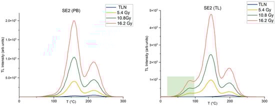 Furthermore, as introduced before, the curves of the samples were evaluated using a classical thermoluminescence measurement, without further steps. A comparison of some of the curves of samples using the “Pre-bleached with Blue LED” method and a classical thermoluminescence protocol is shown in Figure 4 to emphasize how the method proposed in this work cuts out all of the signal before 100 °C.