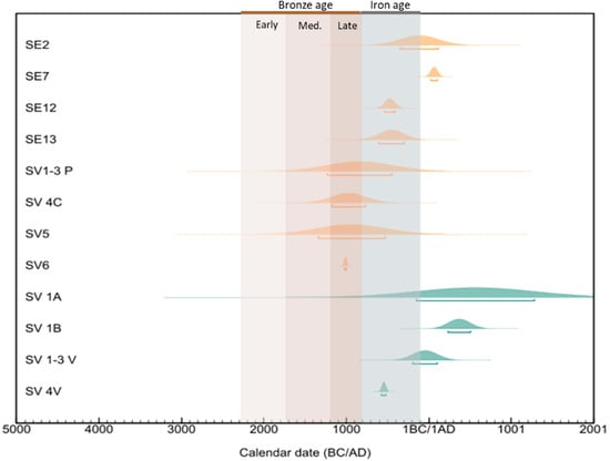 Final date ranges in correspondence to the Bronze and Iron Ages in southern Italy. In orange are samples belonging to the category of heated or partially vitrified rocks. In light blue are the vitreous cements.
