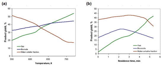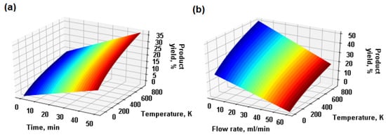 Effects of temperature (a) and residence time distribution (b) on product yield, %.