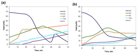 Effects of temperature for (a) 600 K and (b) 400 K on biocrude oil (BC) and aqueous phase (AQ) gas, and Vt, volatile yield (wt.%).