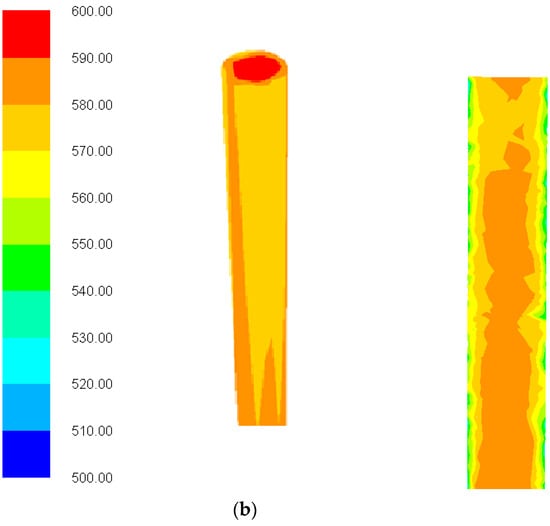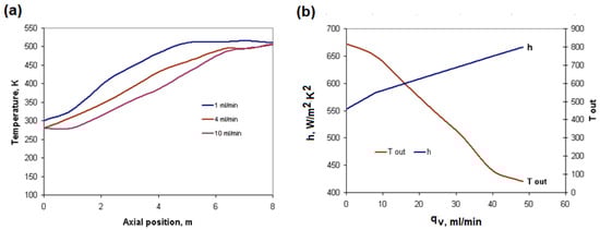 Figure 5a shows the effect of the slurry flow rate in the axial direction on the reactor temperature. As the flow rate increased, the temperature of the slurry in the flow decreased, which was related to both the heat transfer coefficient and the residence time of the slurry. Figure 5b shows the convective heat transfer coefficient and discharge temperature of the suspended sludge in a tube reactor. It can be observed that the convective heat transfer coefficient of the sewage sludge slurry increased from 550 to 667 W·m−2·K−1 with the increase of the flow rate from 0 to 52 mL/min, while the temperature decreased from 670 to 423 K. In this situation, the conversion rate of the biosolids, assisted by the convective heat transfer coefficient of the slurry by increasing the flow rate in a simple tube reactor, resulted in a lower biomass conversion rate, which is why it is important to ensure a constant temperature throughout the reactor.