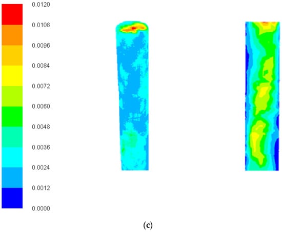 Contour plots of the slurry flow velocity, temperature, gas mass fraction, and biocrude oil are shown in Figure 6a. Figure 6a illustrates that laminar flow leads to the highest slurry velocity in the center of the tubular reactor, potentially causing clogging, caused by clumping of solid particles. This non-uniform flow likely arises from fluctuations in the reactor volume and pressure drop. Pressure fluctuations in the system depend mainly on the reactor volume, solid particle size distribution, as well as the kinematic viscosity and flow rate of the reactor slurry. Therefore, pressure drops can be significantly used to indicate the degree of reactor clogging. An overall high ash content increases the probability of flow clogging in a tubular reactor (>24.1%). Additionally, the possibility of clogging increases with the increasing kinematic viscosity (>8.6 mm2/s) and solid particles’ diameter. Therefore, the ash content has a significant impact on the possibility of reactor clogging. Potentially, this problem can be solved by increasing the heating efficiency of the reactor, allowing rapid liquefaction of the feedstock, reducing the ash content of the feedstock, or increasing the tube diameter. Figure 6b shows the temperature distribution of the reactor, where it can be seen that this temperature gradient was mainly due to heat transfer from the reactor wall to the slurry mixture, which had a temperature of about 300 K at the reactor inlet. For the most part, the sludge suspension behaved according to the thermodynamic properties of subcritical water. In Figure 6c, using contours plot of the gas mass fraction in the external view of the reactor and its cross-section, it can be seen that the fluid velocity was lower at the reactor wall and the reactor wall was warmer, which accumulated more gas. In Figure 6c, the biocrude oil concentration is presented, which was irregularly distributed in the middle of the tubular reactor due to hydrodynamic conditions related to mass and heat exchange in the mass flow. Trajectories of the solid particles were significantly affected by the ash flow and the solid particle size, and thus the trajectories of particles were streamlined.