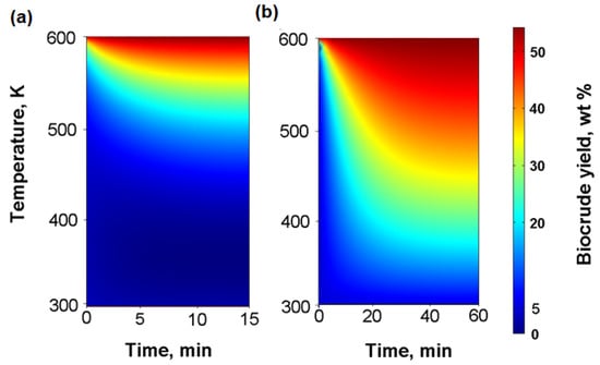 Effects of temperature and process time on biocrude yield in the plug-flow tube HTL reactor for (a) 15 min (b) 60 min.