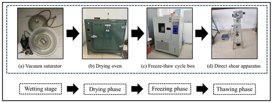 During the operation of the canal, the loess at the base of the canal undergoes WD and FT cycles simultaneously. Before the implementation of the WD-FT cycle test, the boundary conditions were first set, as presented in Table 2. Then, a series of laboratory direct shear tests were performed on the specimens with various WD-FT cycles to determine the change rule of the mechanical parameters of the loess. The ZJ50-1A type strain-controlled direct shear instrument was used to carry out consolidated quick shear tests on the specimens with different cycles to obtain the change rule of the strength parameters of the loess. The test process is shown in Figure 1.