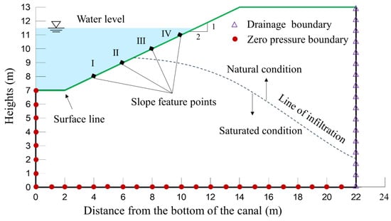The SEEP/W module in Geo-Studio 2020 was used to simulate the steady-state seepage of the canal. The influence mechanisms of different heights of the seepage overflow point and water levels during the operation period on the change in the infiltration line and pore water pressure of the canal slope were analyzed. To simplify the model, groundwater and rainfall boundary conditions were not considered. The top, bottom, and left boundaries of the model were set as zero-flow boundaries, while the slope side and right boundaries of the canal were set as permeable boundaries. The simplified cross-section of the canal is shown in Figure 2.